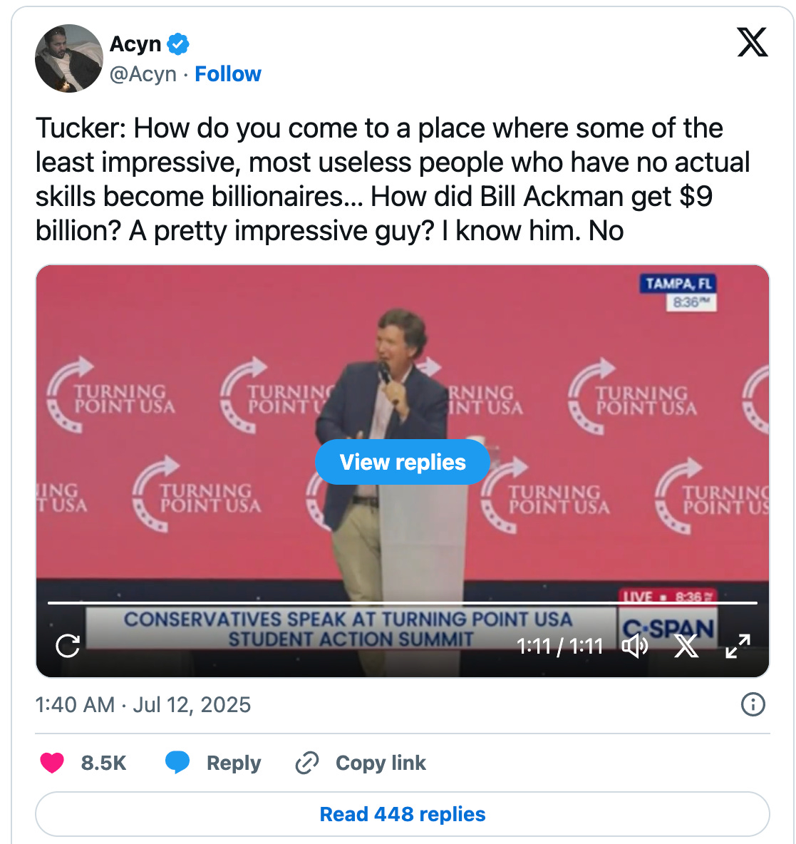 This July, at his TPUSA Student Action Summit, Kirk provided a forum for the right-wing grassroots to vent its fury about Israel’s political hammerlock on the Trump administration. There, speakers from former Fox News stalwarts Tucker Carlson and Megyn Kelly, to the anti-Zionist Jewish comedian Dave Smith, denounced Israel’s blood-soaked assault on the besieged Gaza Strip, branded Jeffrey Epstein as an Israeli intelligence asset, and openly taunted Zionist billionaires like Bill Ackman for “getting away with scams” despite having “no actual skills.”