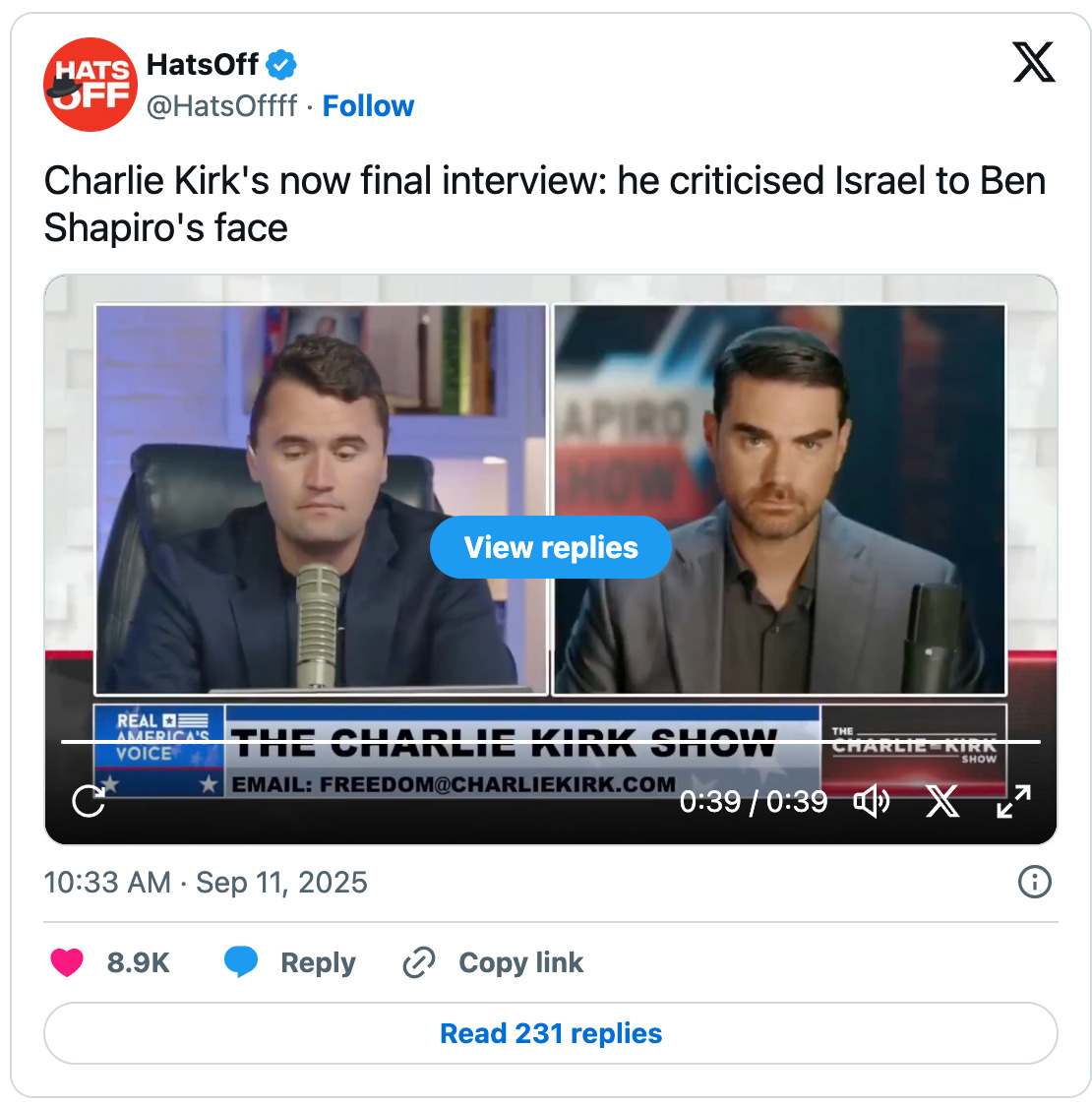 In one of his final interviews, conducted with Israel’s premier influencer in the United States, Ben Shapiro, Kirk once again tried to raise the issue of censorship of Israel critics.