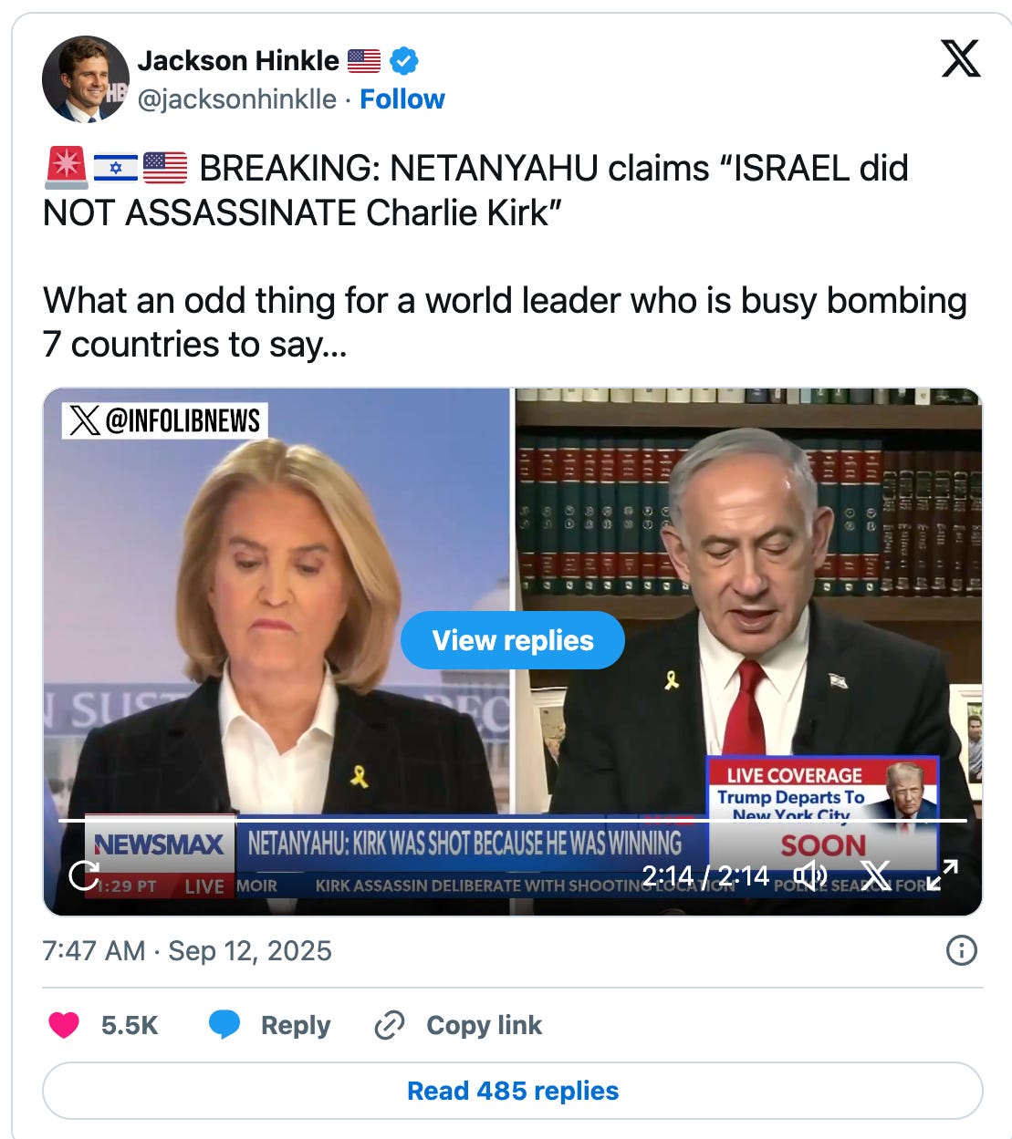 During that interview, Netanyahu did his best to insinuate that Israel’s enemies were responsible for murdering Kirk, despite the fact no suspect was named or in custody at the time: