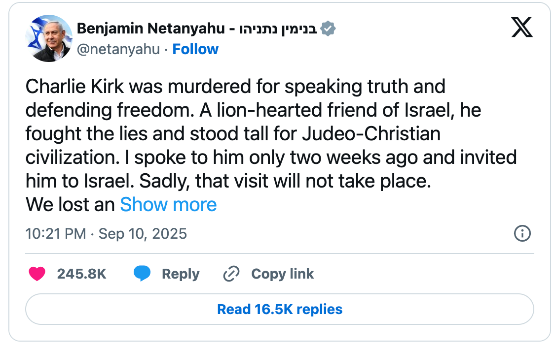 Netanyahu first tweeted prayers for Kirk at 3:02 PM in the afternoon on September 10, minutes after news of the shooting broke. He has since authored three additional posts about Kirk, even breaking away from the Israeli war cabinet to spend the afternoon of September 11 memorializing the conservative leader on Fox News.