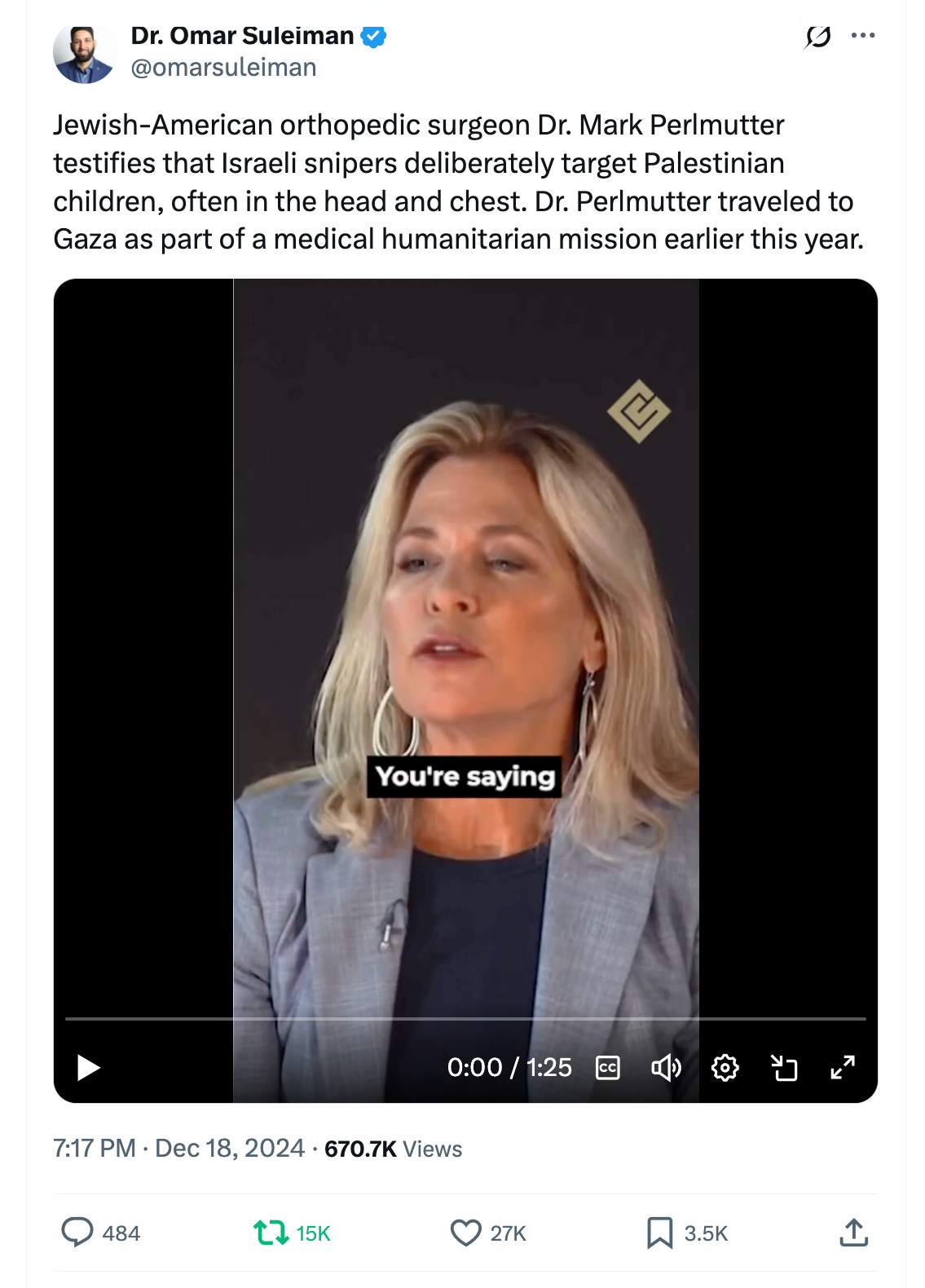 There is also Dr. Perlmutter’s horrific testimony regarding precision IDF sniper bullet wounds which he observed on the bodies of dead children in Gaza.