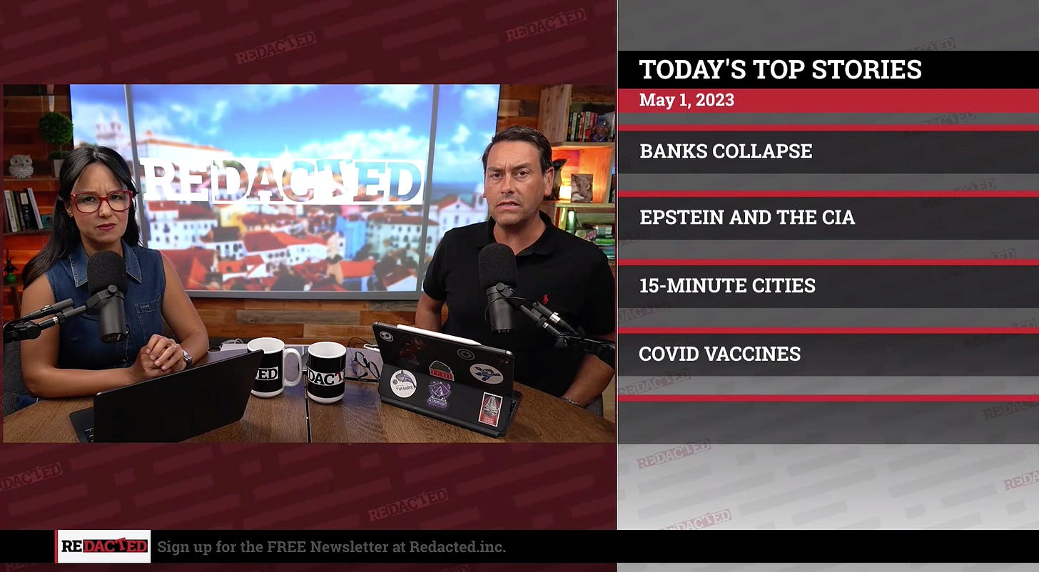 Redacted’s news programme from Monday, 1st May is well worth watching as Clayton and Natali discuss the latest American bank collapse/takeover, the WEF et al’s 15 Minute Cities as expressed by German Christine Anderson and more.